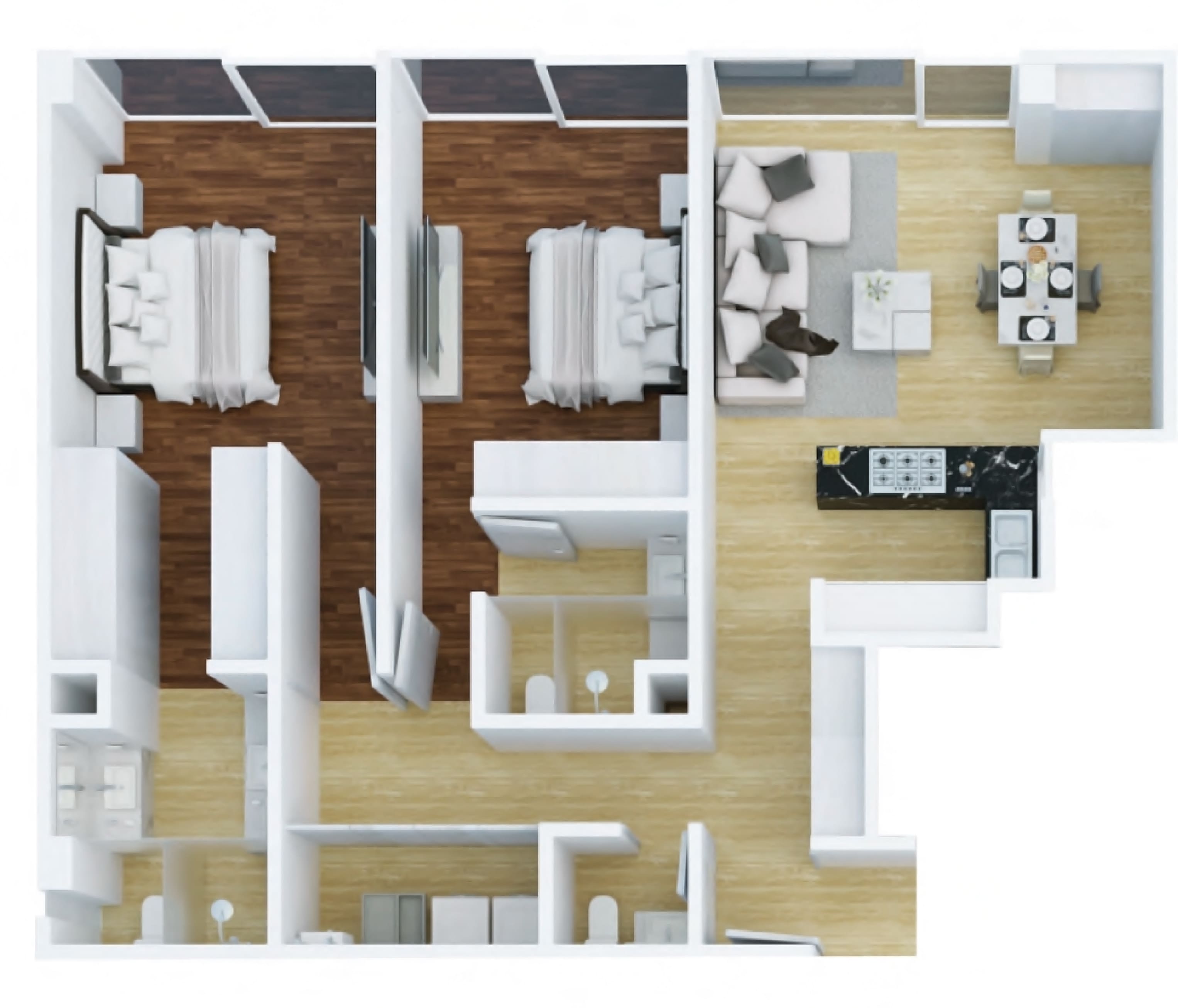 Cuenta con 2 recámaras y 2 baños completos y el medio baño. La cocina de diseño espectacular es el centro de atención, brindando un espacio funcional y moderno. La sala de estar y el comedor ofrecen un ambiente acogedor y elegante. Además, estos departamentos cuentan con un cuarto de lavado y un family room.